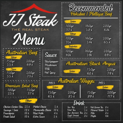 Menunya beneran beda sama tempat makannya yang sederhana karena daging steak yang ditawarkan beneran premium. Dari australian beef, premium lokal beef, hokubee / meltique beef, australian black angus serta australian wagyu. Semuanya tersedia dengan berbagai ukuran. Dan disini kita juga bisa lihat proses memasak steaknya.